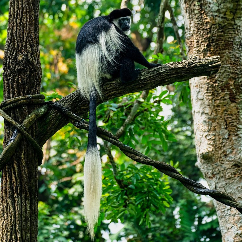 The majority of the animals live in the rainforest and moorland. They include black-and-white colobus monkeys, which are the most striking of the monkey species and are happily seen quite often. The other primates living in the trees are blue monkeys, baboons, and bush babies. Servals, white tailed mongooses, and even leopards live on the mountain, but they’re outrageously hard to find.