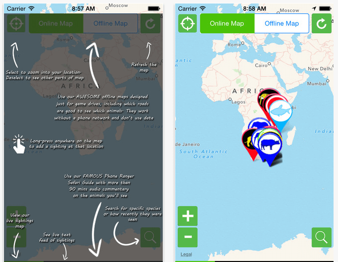 The winner of the best travel app in Africa competition, Africa: Live allows you share your real-time wildlife sightings on live maps so your friends can follow your trip, but it also helps you find animals, as you can see what wildlife sightings have been recorded in the past 24 hours by other safari goers and professional wildlife guides. It’s currently the only live map of Africa that shows your location and the location of recent sightings. The app also has a feel-good slant: you can contribute to conservation research by helping wildlife audits by uploading your sightings.