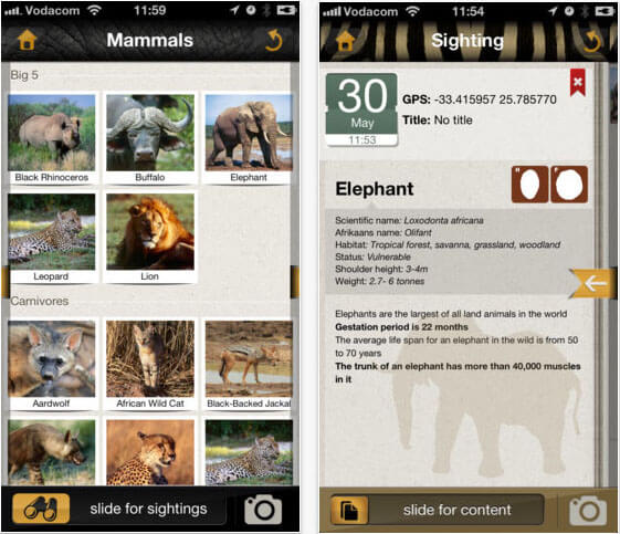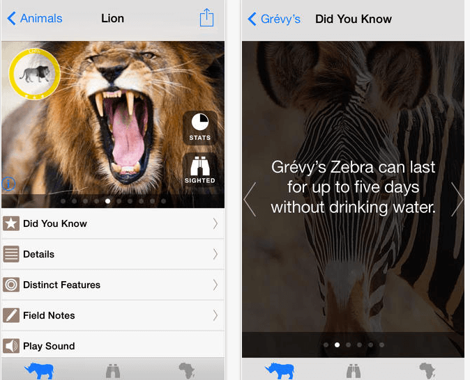 With 200 animals, 500 photos, sounds of the Big Five, and a checklist map for all the animal sightings you have on your trip, this app is a great all-round guide to African animals for any safari trip. It also offers a checklist so you can track all your wildlife sightings, as well as handy overviews of 11 of the most visited national parks in Africa, including Chobe National Park, Etosha National Park, Kruger National Park, Masai Mara National Park, Serengeti National Park and Queen Elizabeth National Park. The best thing about this app is that it works offline! Just download it when you have wifi and then you can use it for the rest of the trip without an Internet connection – perfect for when you’re far from civilization in the African bush.