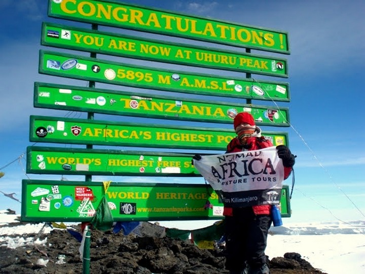 Begin the final and most challenging stage of your Kilimanjaro ascent: a gradual, one-hour climb towards the summit of Uhuru Peak (5,895 meters / 19,341 feet) along the snow-covered trail. Brace yourself for frigid temperatures, as summit conditions can range from -23°C (-9°F) in the morning to just below freezing overnight. With each step, you’ll be closer to achieving your goal. Finally, reach the summit of Uhuru Peak! Take a deep breath, soak in the breathtaking panoramic views, and celebrate this incredible accomplishment