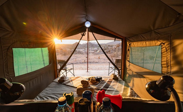 Your journey today takes you into the rugged beauty and breathtaking landscapes of Damaraland. Your destination is Ozondjou Trails, an intimate camp whose name, “Ozondjou,” is the Herero word for elephants – a fitting tribute as the camp actively supports the Elephant Human Relations Aid (EHRA) conservation efforts. Here, you’ll not only experience the natural wonders of Damaraland but also witness the meaningful coexistence between humans and the majestic desert-adapted elephants. This afternoon, you’ll embark on a unique visit to a local farmer, gaining insights into the challenges of farming alongside free-roaming wildlife. Conclude the afternoon with a short walk and refreshing sundowners before returning to camp for a delicious fire-prepared 3-course dinner and overnight stay.