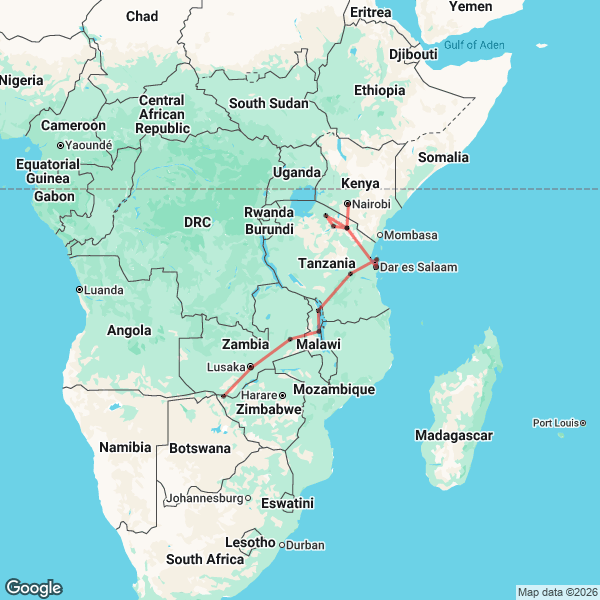 21 Days Livingstone to Nairobi Overland Map