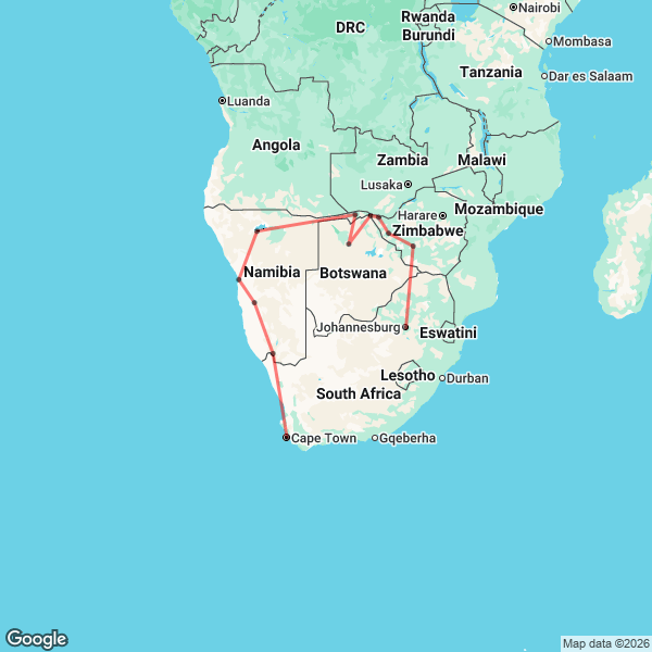It is a 20-day tour (19 nights). It can be done in either a North (Cape Town to Victoria Falls) or South direction (Victoria Falls to Cape Town). The expedition covers South Africa, Namibia, Botswana, and Zimbabwe The tour is offered in two main versions: a camping option or an accommodated version.
