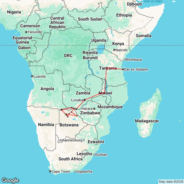 Embark on an epic 29 day African adventure, starting at the majestic Victoria Falls before tracing the Zambezi westward into Namibia’s wildlife-rich Caprivi Strip and the tranquil Okavango River at Popa Falls. Delve into Botswana’s iconic Okavango Delta, navigating its watery channels by mokoro and discovering the ancient rock art of Tsodilo Hills, then enjoy thrilling safaris in Moremi Game Reserve and an intimate Chobe National Park boat cruise among its many elephants. Journey through Zambia’s diverse landscapes, experiencing world-class safaris including sunset and optional walking safaris in South Luangwa National Park, famous for its nocturnal species. Unwind by the serene shores of Lake Malawi, the “warm heart of Africa,” before venturing into Tanzania for captivating coffee plantation tours and immersive game drives in Mikumi National Park amidst ancient baobab trees. Conclude your grand journey on the tropical island of Zanzibar, exploring historic Stone Town, vibrant spice farms, and indulging in idyllic beach relaxation and exhilarating water sports.
