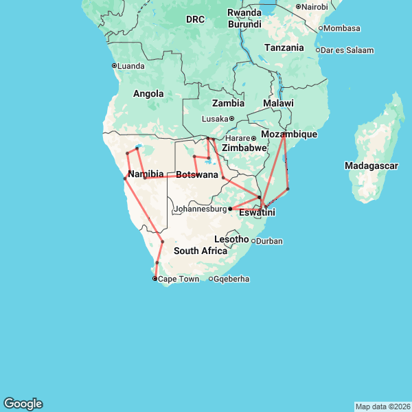 It is a 20-day tour (19 nights). It can be done in either a North (Cape Town to Victoria Falls) or South direction (Victoria Falls to Cape Town). The expedition covers South Africa, Namibia, Botswana, and Zimbabwe The tour is offered in two main versions: a camping option or an accommodated version.