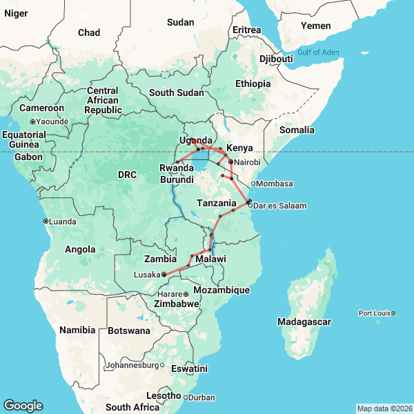 37 Day Nairobi to Livingstone and Gorillas Journey Map