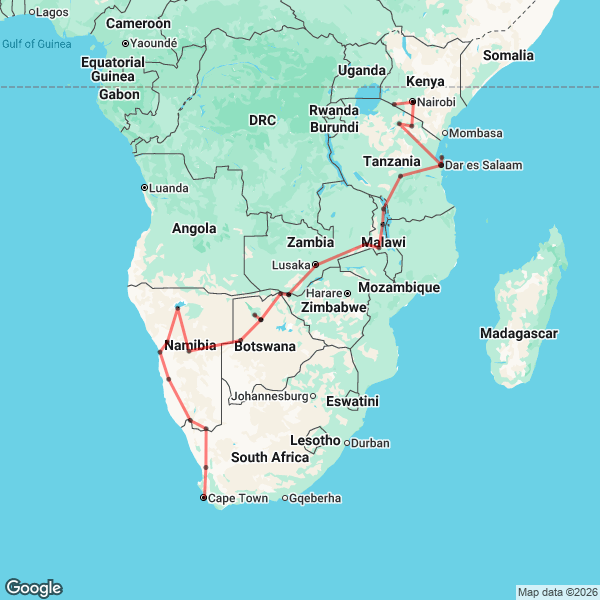 This Kenya to Cape Town Overland Adventure offers you fantastic insights into some of East Africa and Southern Africa’s greatest attractions and cultures. We visit the Masai Mara, the flat plains of the Serengeti, the Ngorongoro Crater before relaxing on the sun-kissed beaches on the exotic island of Zanzibar. Prepare to get a bit wet when viewing the mighty Victoria Falls, enjoy a boat cruise down the Chobe River and the Okavango Delta before ending your tour in the beautiful city of Cape Town.