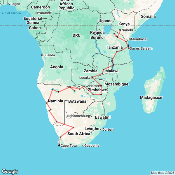 48 Day Kenya to Cape Town Tour Map